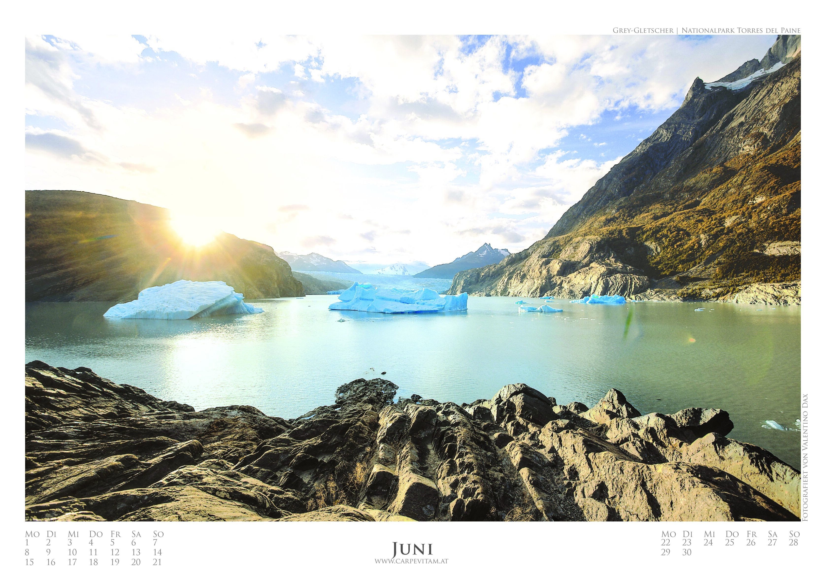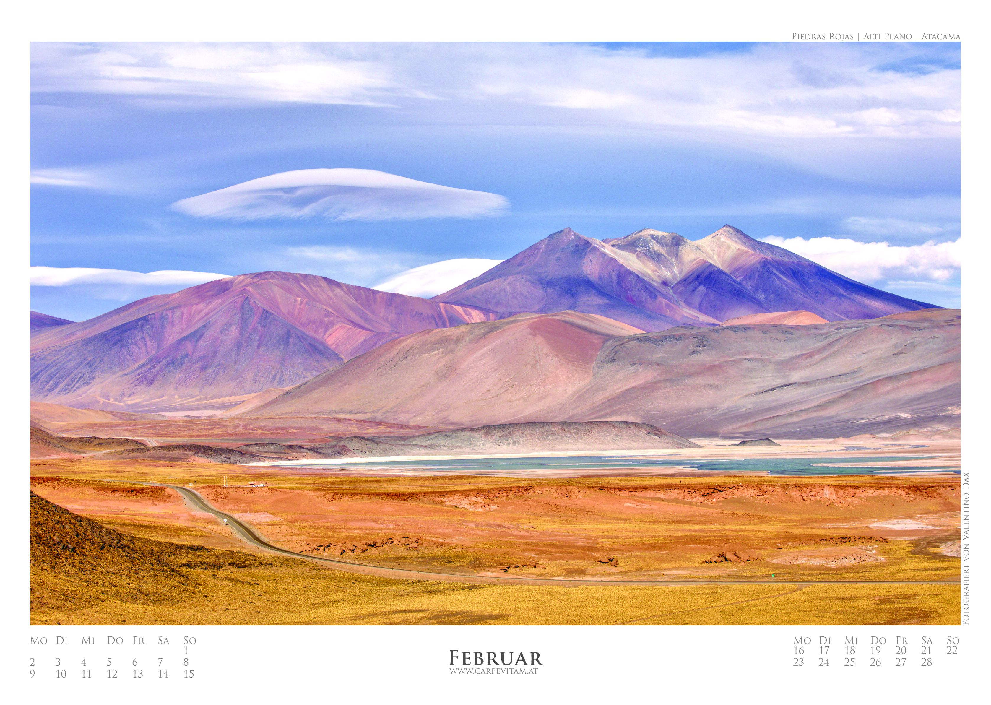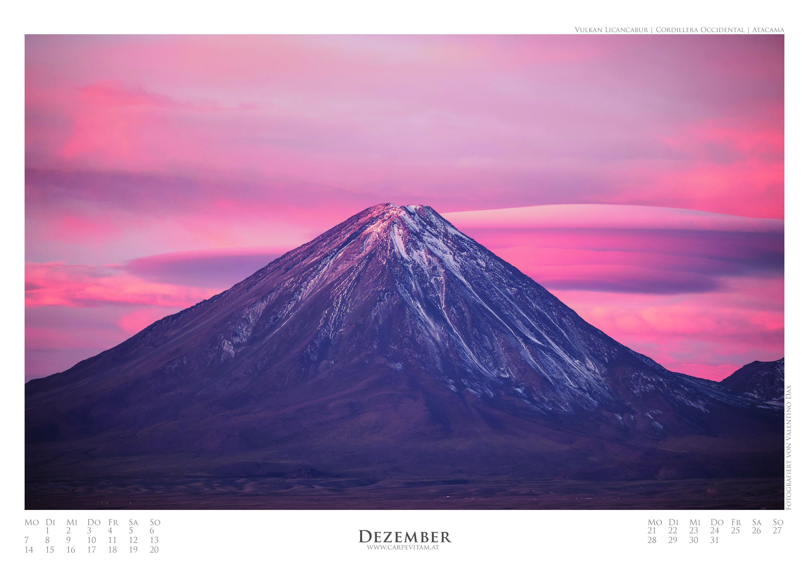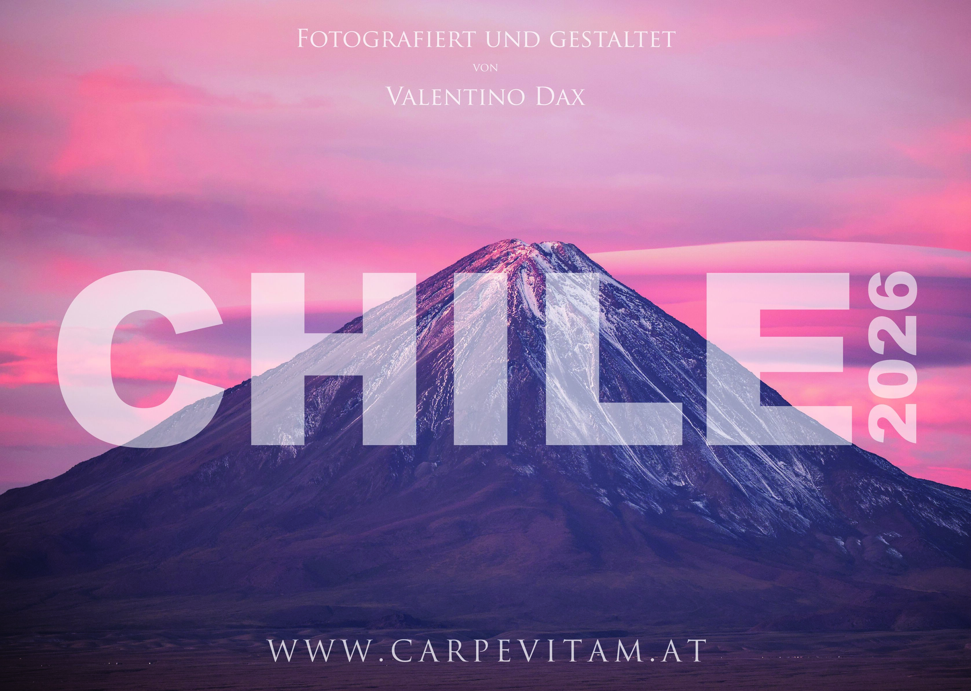 Puerto Williams, das südlichste Dorf am Ende der Welt, liegt am Fuße der Zacken der Dientes del Navarino – südlicher liegen nur Kap Horn und die Antarktis. Auf der anderen Seite trennt der artenreiche Beagle-Kanal die Isla Navarino von den Steppen Feuerlands. Jenseits der Magellanstraße ragen die Granittürme der Torres del Paine in den blauen Himmel, und im Norden des längsten Lands der Welt erheben sich bizarre Sandsteinformationen und die Überreste vulkanischer Aktivitäten aus dem Wüstenboden der Atacama. Mit dem carpevitam-Kalender 2026 geht es nach Chile, ans andere Ende der Welt, in ein Land zwischen Ozeanen, Vulkanen, Eis und Wüste. Der Kalender im A3-Format ist ab sofort für EUR 17,– bestellbar.