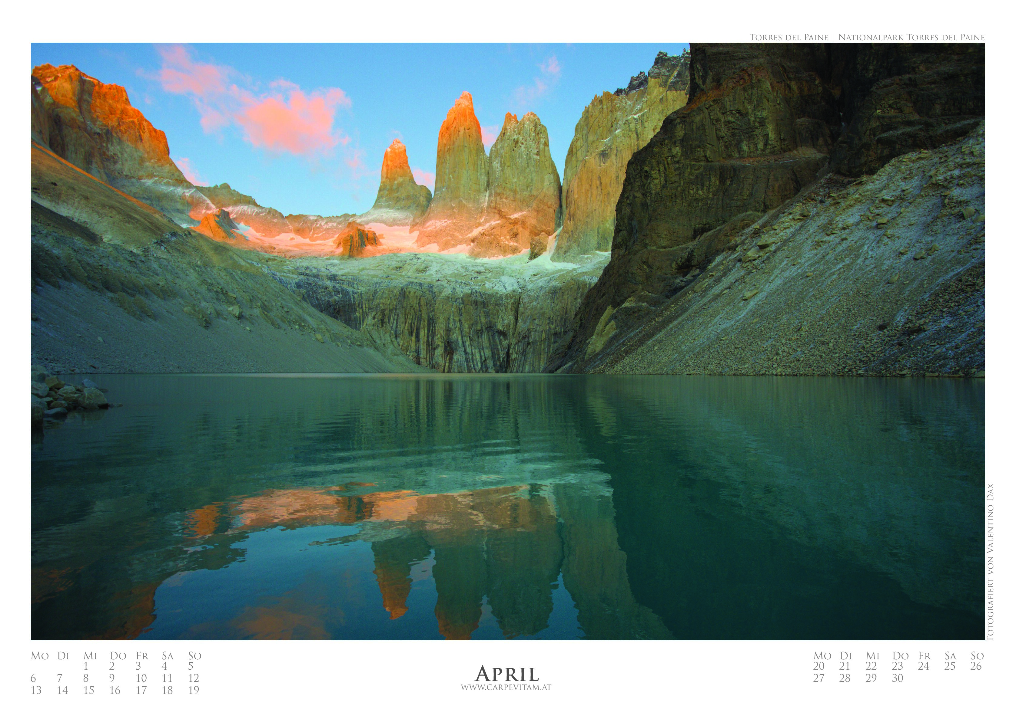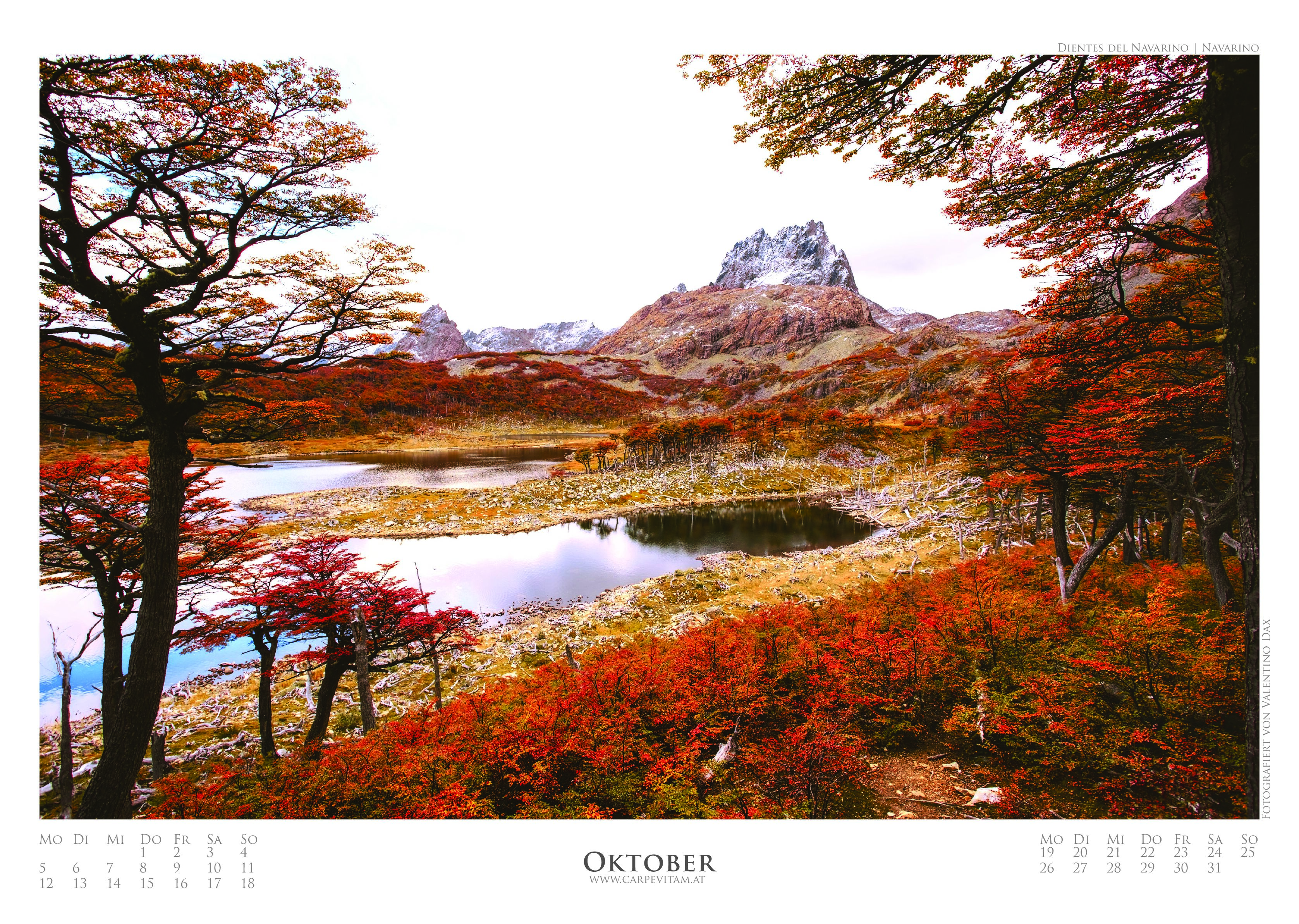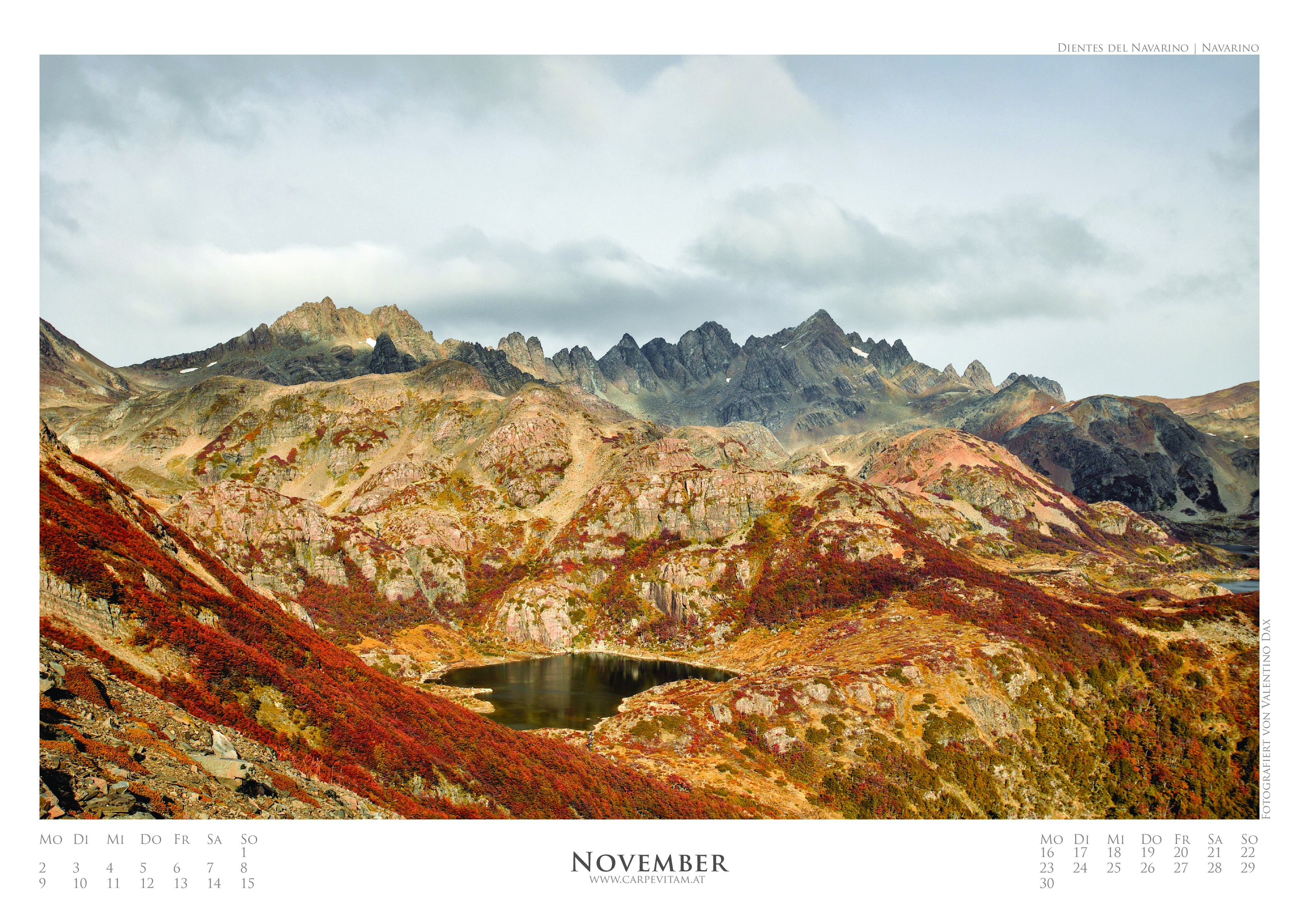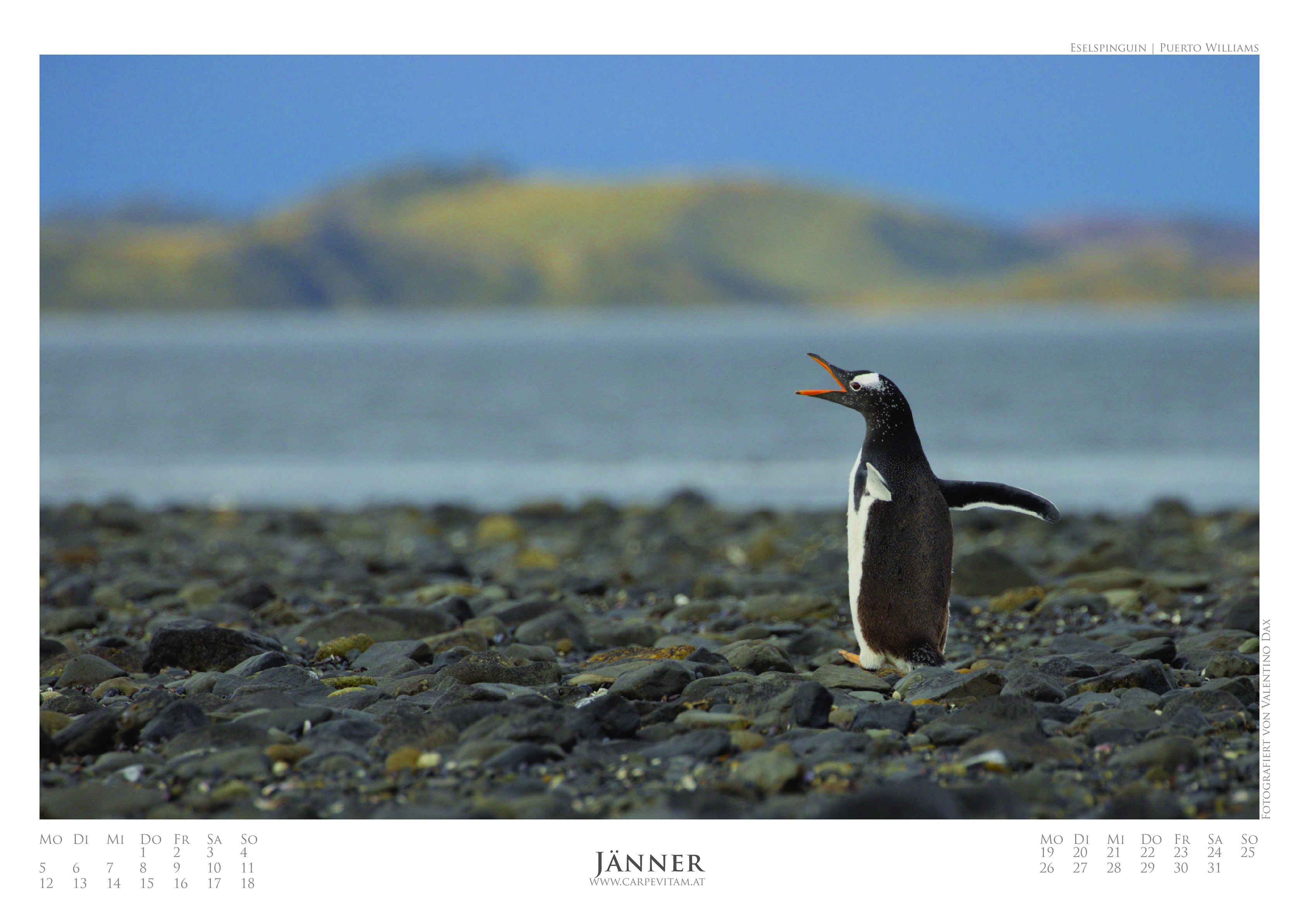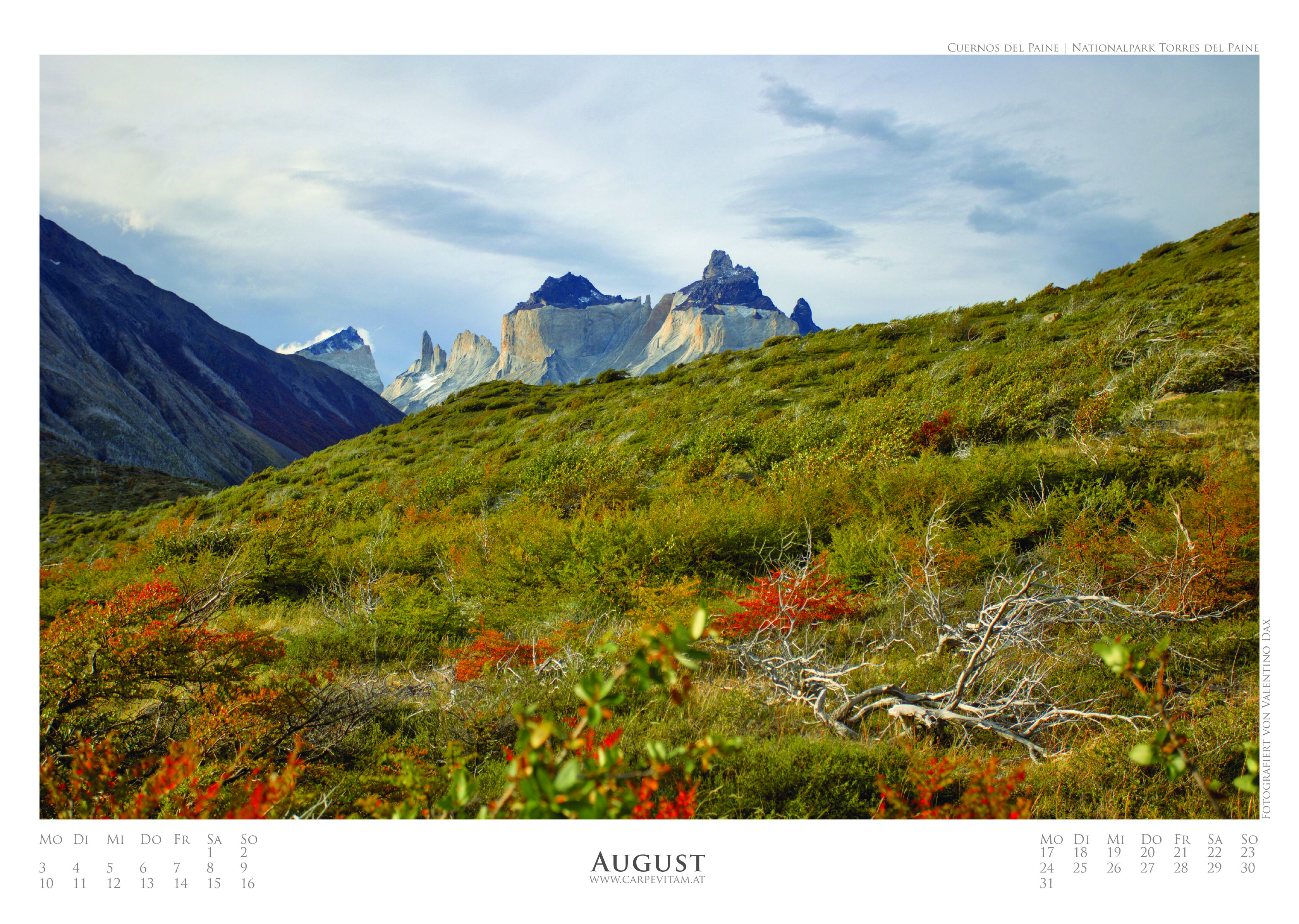 Puerto Williams, das südlichste Dorf am Ende der Welt, liegt am Fuße der Zacken der Dientes del Navarino – südlicher liegen nur Kap Horn und die Antarktis. Auf der anderen Seite trennt der artenreiche Beagle-Kanal die Isla Navarino von den Steppen Feuerlands. Jenseits der Magellanstraße ragen die Granittürme der Torres del Paine in den blauen Himmel, und im Norden des längsten Lands der Welt erheben sich bizarre Sandsteinformationen und die Überreste vulkanischer Aktivitäten aus dem Wüstenboden der Atacama. Mit dem carpevitam-Kalender 2026 geht es nach Chile, ans andere Ende der Welt, in ein Land zwischen Ozeanen, Vulkanen, Eis und Wüste. Der Kalender im A3-Format ist ab sofort für EUR 17,– bestellbar.